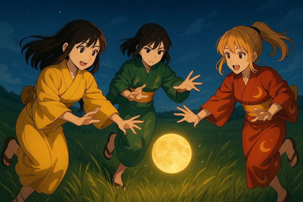 夜の草原を舞台に、月の三姉妹が小さな満月を追いかける幻想的なシーンを描いた最新イラスト。