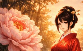 大輪の牡丹が咲き誇る小径で、紅の着物美人が静かに佇む一枚。金の帯や簪、夕陽の粒子光まで描き込まれた和風ファンタジーの魅力を紹介します。
