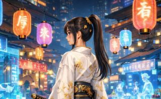 ネオン輝く未来都市の夜市に佇む、白金の金紋刺繍着物を纏った剣士の女性。ホログラム屋台と提灯が交差するサイバー和風イラストを物語風に紹介します。